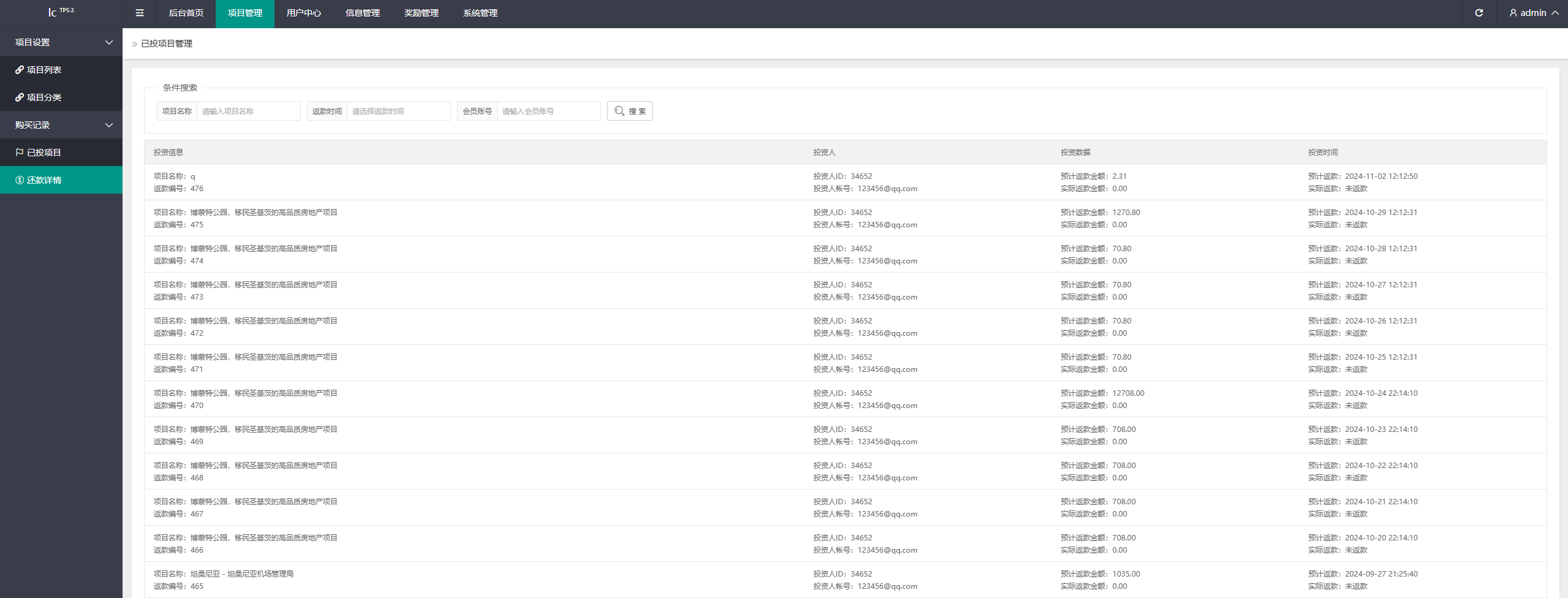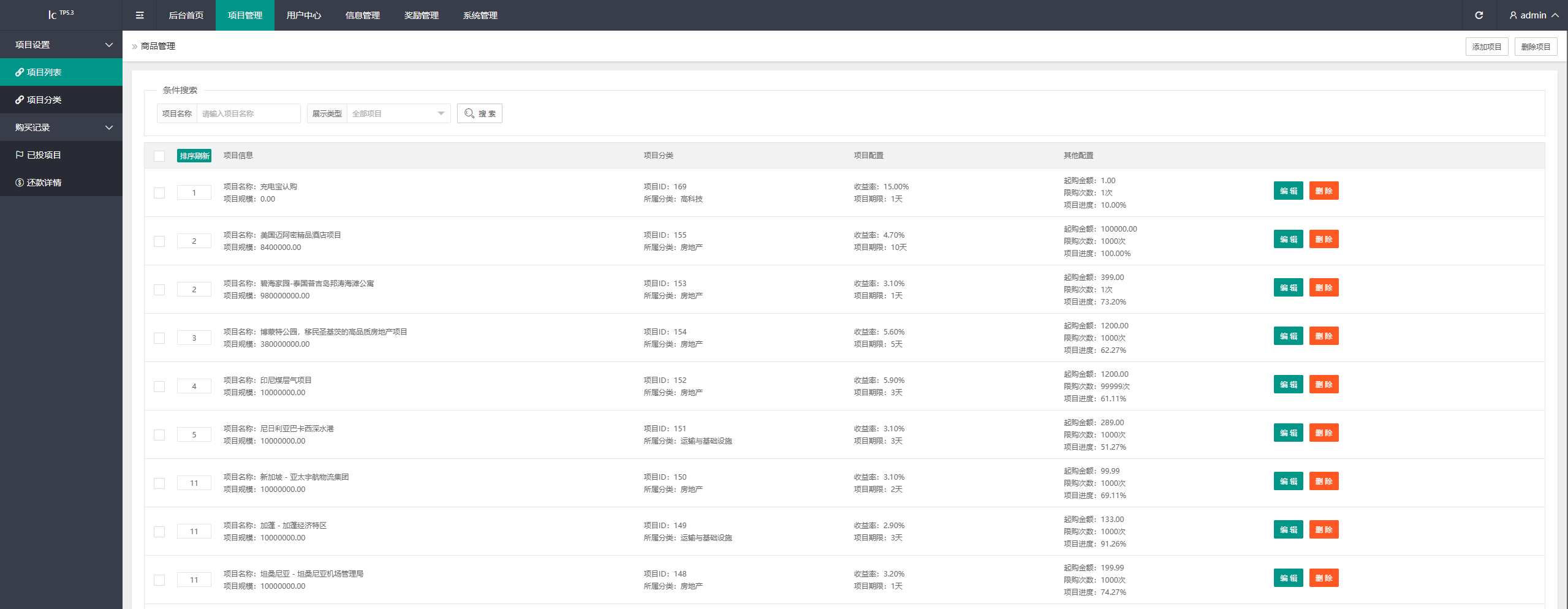 用户注册成功->认证邮箱->充值->购买项目->生成订单->根据设定的收益每日返利->末天返还本金->提现时先添加钱包->发起提现->后台审核通过->提现到账