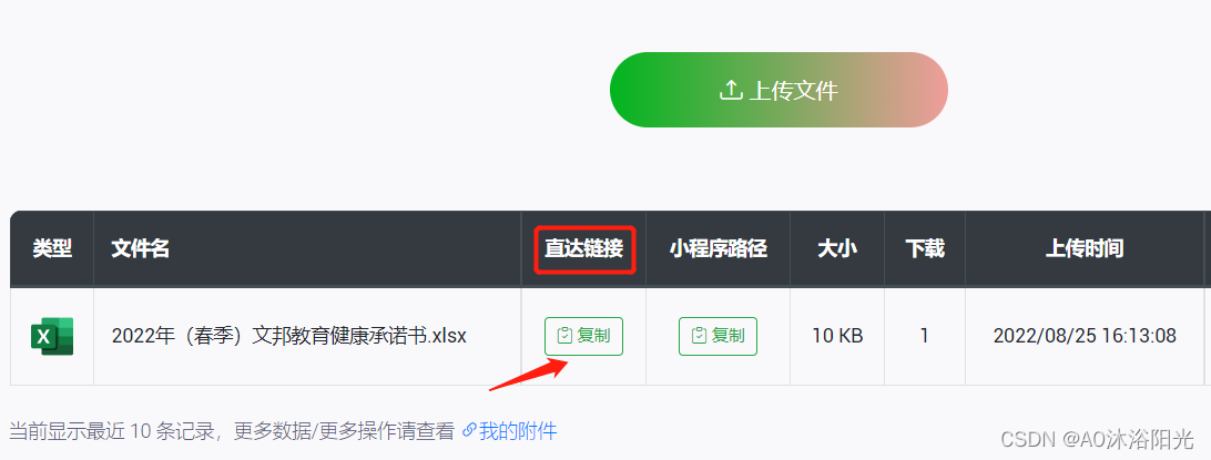 文件上传完成后,我们可以看到文件名称后面有一个“复制”按钮,这个时候我们直接点击直达链接下方的“复制”,对文件进行复制。
