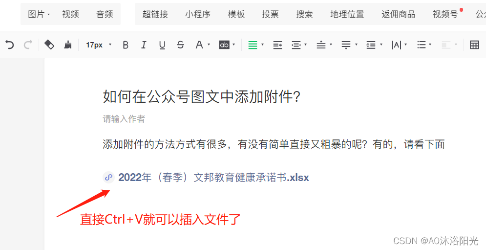 来到我们正在编辑的公众号文章中,在需要添加插入附件的地方,直接Ctrl+V(粘贴)插入附件。附件添加成功,会显示为一个带有S标志的蓝色文件名称,这就证明已经添加插入附件成功了。