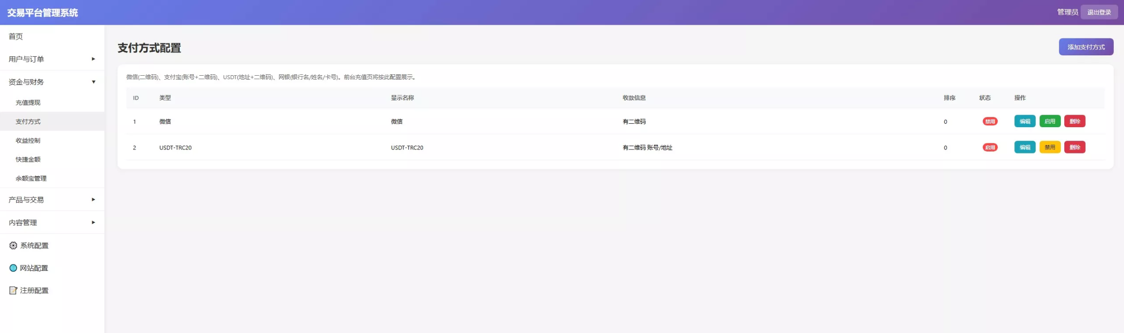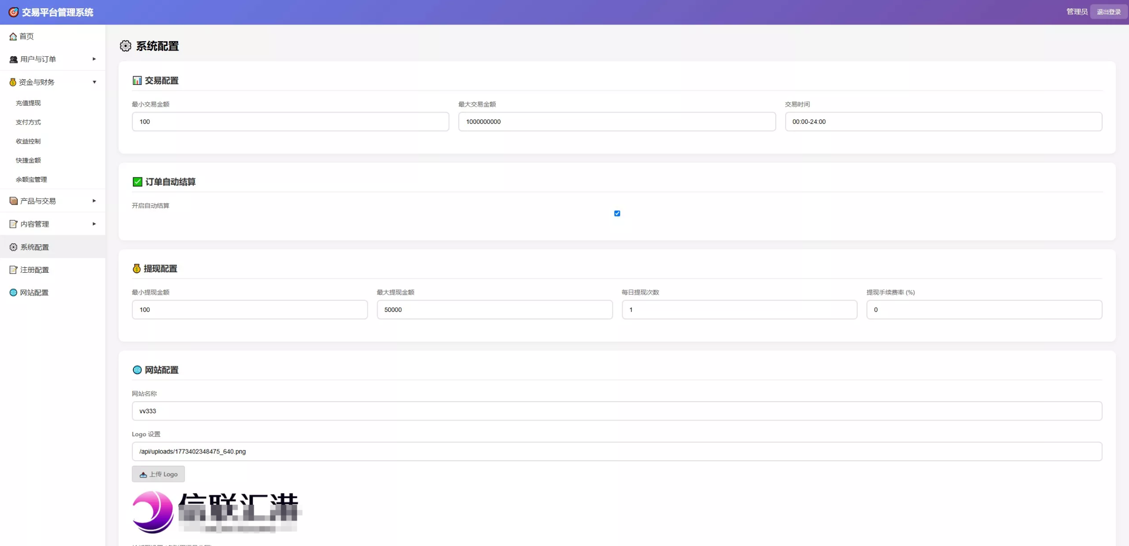 全方位财务管理: 灵活的支付方式配置(WeChat, USDT-TRC20, 银行卡),支持快捷下注金额(100-10000)自定义设置,充值提现流水后台秒级监控。