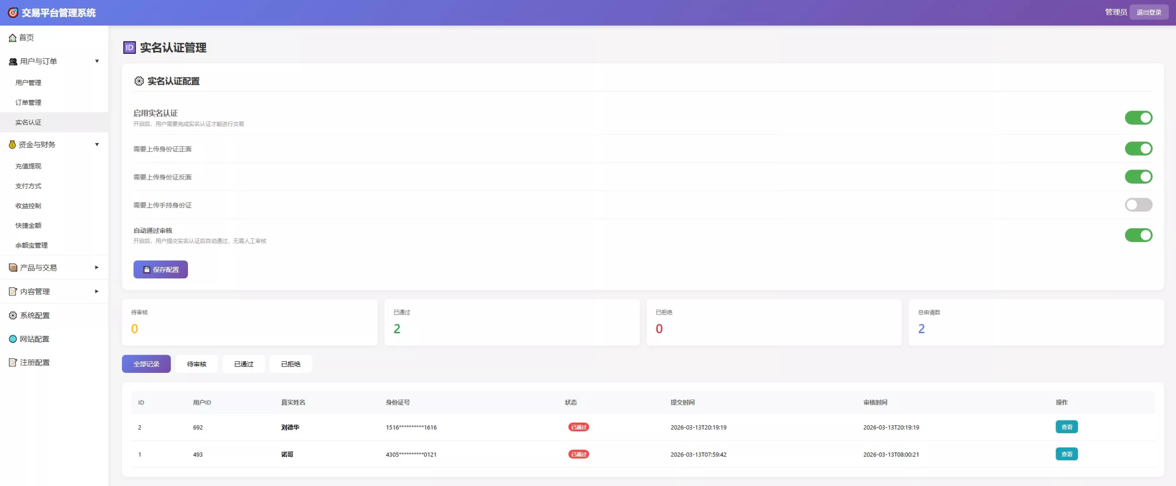 严格 KYC 认证: 完善的实名认证流程,支持身份证正反面及手持照上传,后台可一键配置启用或自动通过审核。