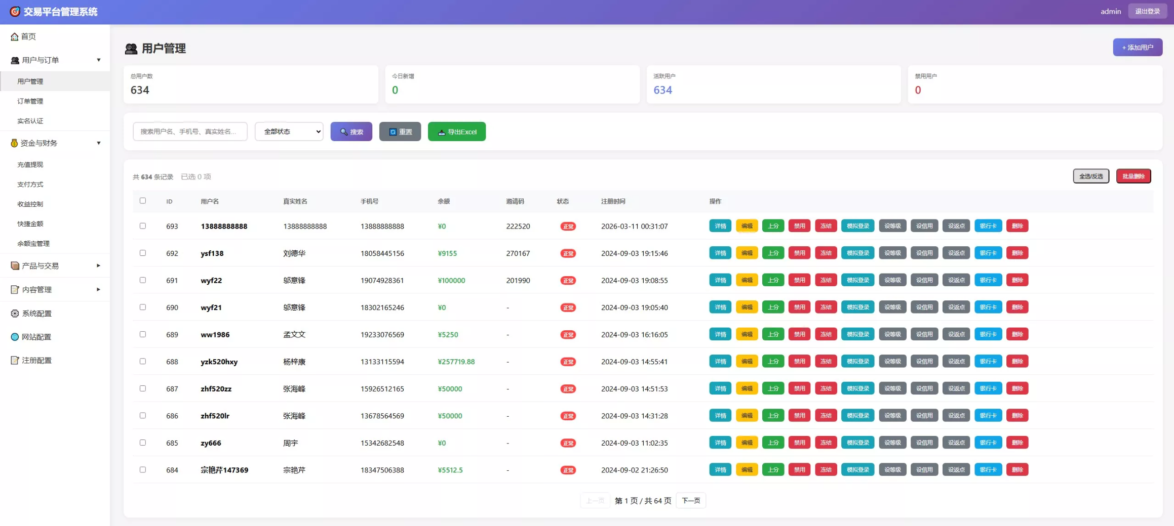 实时监控今日订单量、客户盈亏额、当日流水及手续费总额。