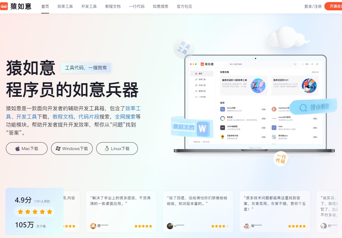 猿如意是一款面向开发者的辅助开发工具箱,包含了效率工具,开发工具下载,文档教程,代码片段搜索,全网搜索等功能模块.帮助开发者提升开发效率,帮你从“问题”找到“答案”.